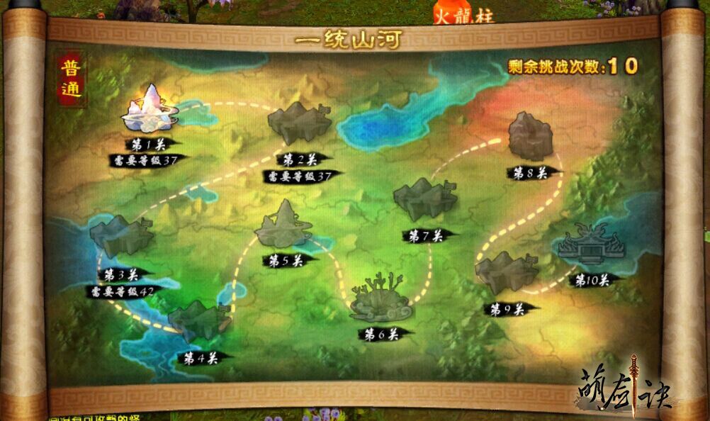 一統山河由十個小關卡組合而成,玩家可在此副本中獲得豐富裝備,分為普通、困難、煉獄三種難度。副本難度越高,進入等級要求越高,怪物與 BOSS 也越聰明、強大。玩家達到 32 級,即可進入第一個副本,不同的副本有不同的等級門檻。