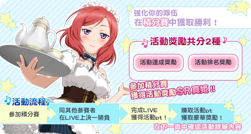 LoveLive! 學園偶像祭》的玩家只要參加對戰積分賽,賺取 pt 就有機會獲得活動獎勵「SR 真姬」。