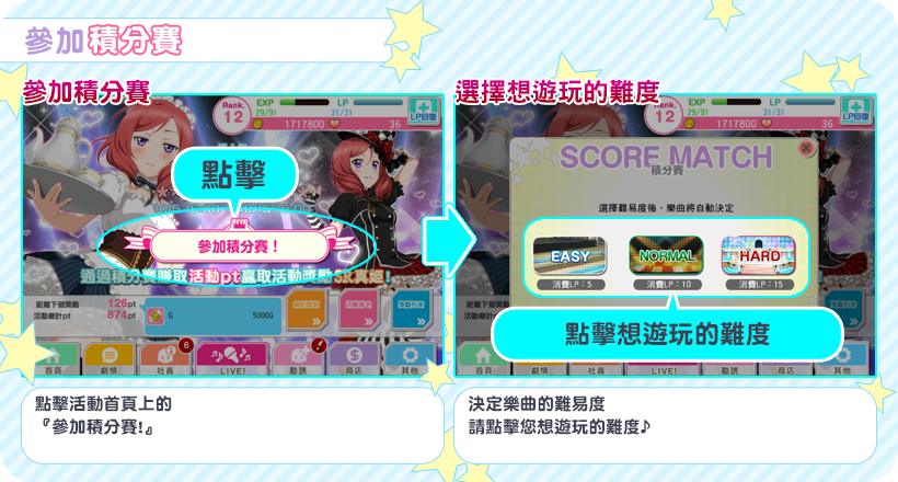 LoveLive! 學園偶像祭》遊戲首頁的「SCORE MATCH」積分賽活動入口,點擊「參加積分賽」後,即可選擇希望對戰的歌曲難易度,難易度包含「EASY」、「NORMAL」、「HARD」共三種,選取完成後即可看到對戰的指定歌曲,玩家此時可依照指定歌曲的屬性來調整合適的參賽隊伍。