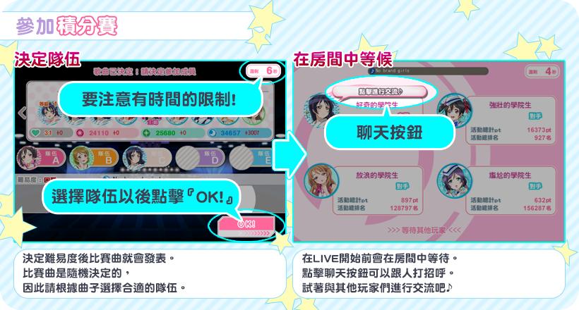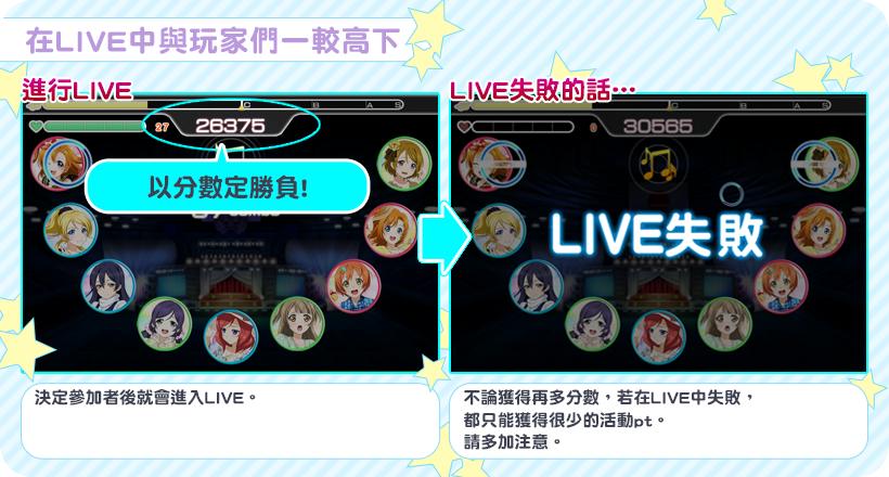在「SCORE MATCH」LIVE 積分賽中是以挑戰的「歌曲分數」來決定對戰結果的排名,對戰結果的「排名」及「歌曲分數」都將影響獲得的活動 pt;若不幸 LIVE 失敗時,不論分數多高都只能獲得非常少量的活動 pt。