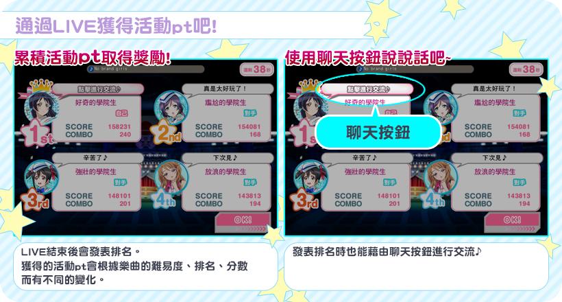 當 LIVE 結束後系統會發表比賽排名,在發表排名的同時,一樣可以使用聊天按鈕與對手們交流互動。當然,根據選定對戰歌曲的難易度,所獲得的活動 pt 也會有所變化。