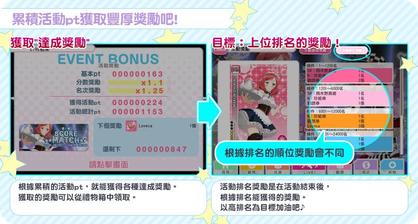 LoveLive! 學園偶像祭》第一回 SCORE MATCH 終於登場,玩家除了可以體驗到與其他玩家一起即時對戰的樂趣外,每次比賽都可獲得活動 pt 的積分,累積活動 pt 還可額外獲得獎勵。《