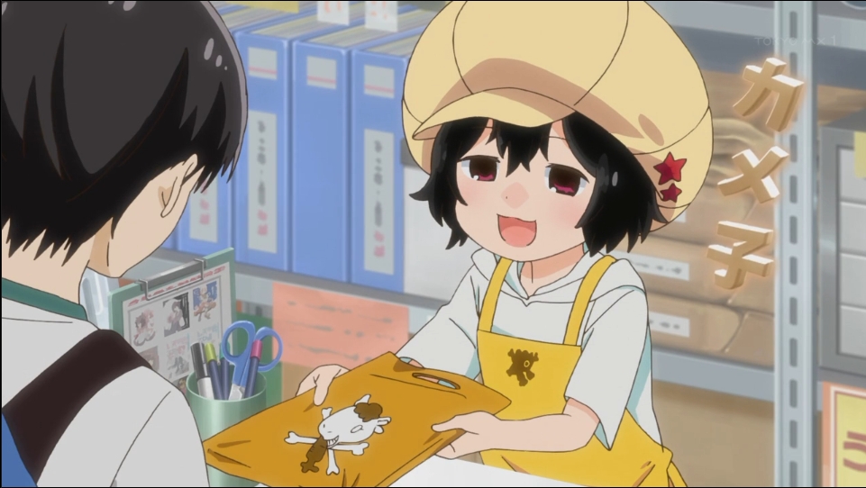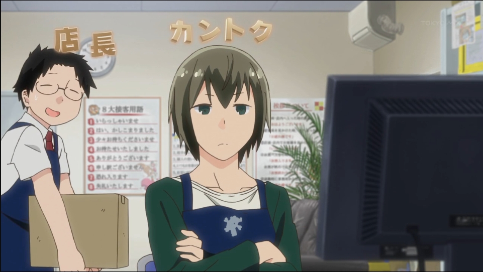 在故事展開上,或許是為了衝擊性和帶入角色,動畫第一話其實就融入了原作漫畫中前三回中的劇情。但即便有些許的劇情被跳過,整體的起承轉合還是整合的不錯,展現了本作的「搞笑」、「宅文化」、「漫畫店員日常」三種元素。在作畫以及 BGM 的處理上也十分到位,許多動畫才加入的特殊效果也讓觀眾更能融入氣氛,相信即使不是那麼熟悉宅文化的觀眾也能輕鬆的享受。