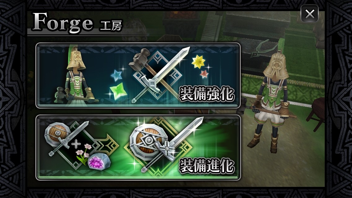 武器跟防具都可在工房進行強化與進化。選擇想要強化的裝備以及專用的「強化素材」,再消耗遊戲貨幣「金幣」即可強化。