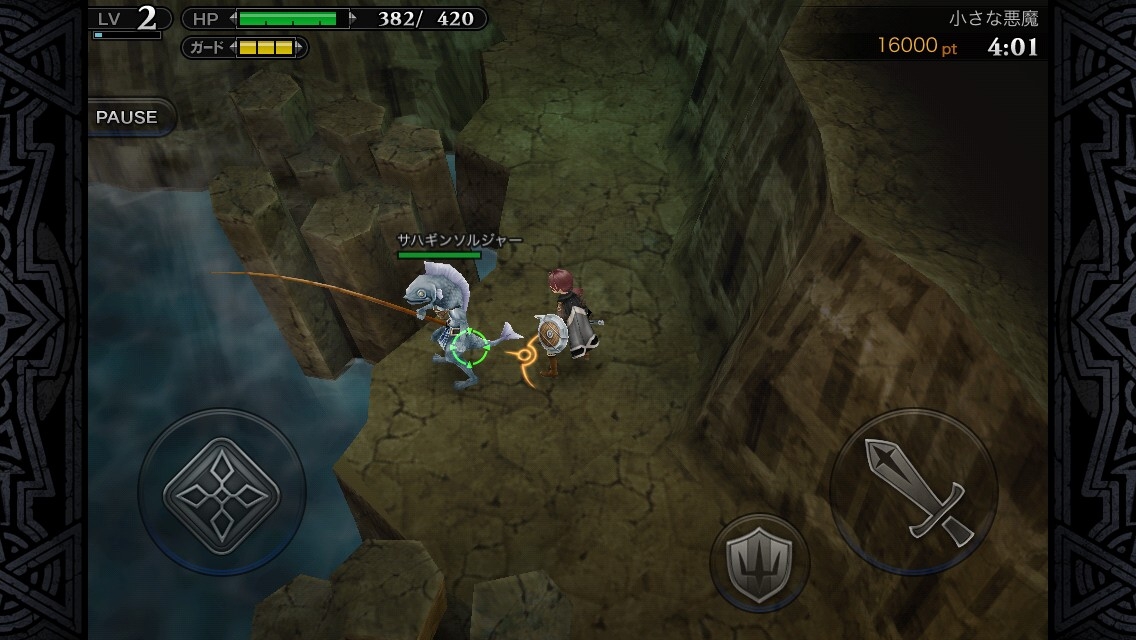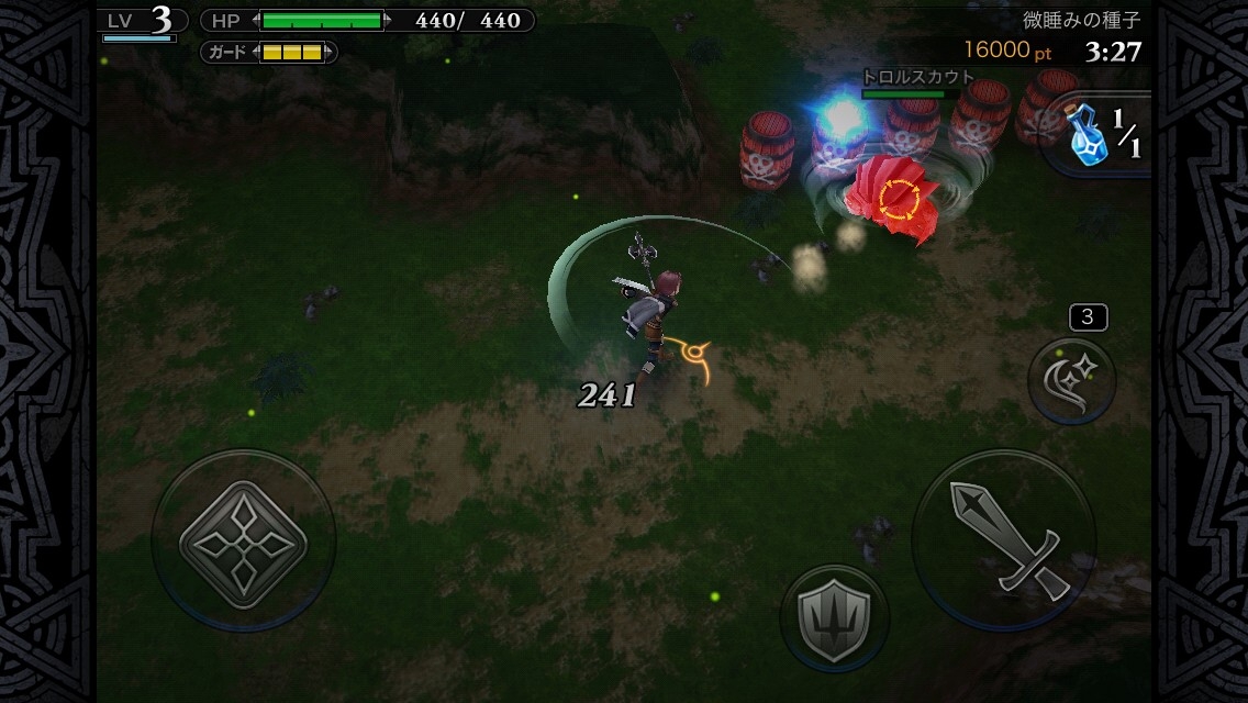 移動要透過按住畫面左下的虛擬手把來進行,往想要前進的方向滑過去即可。因為也可以做細微調整的關係,所以這部分並沒有特別感到不滿的地方。在畫面右下有配置著跟戰鬥有關的圖示,在任務中就必須活用這些來與魔物戰鬥。
