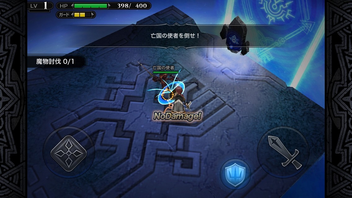 按住防禦圖示的話,在放開前都可以進行防禦動作。另外,快速觸碰防禦圖示的話就會使出「迴避」動作,可自由的選擇方向來迴避。因此,也會有閃過魔物的攻擊來繞到背後進行攻擊的戰略出現。