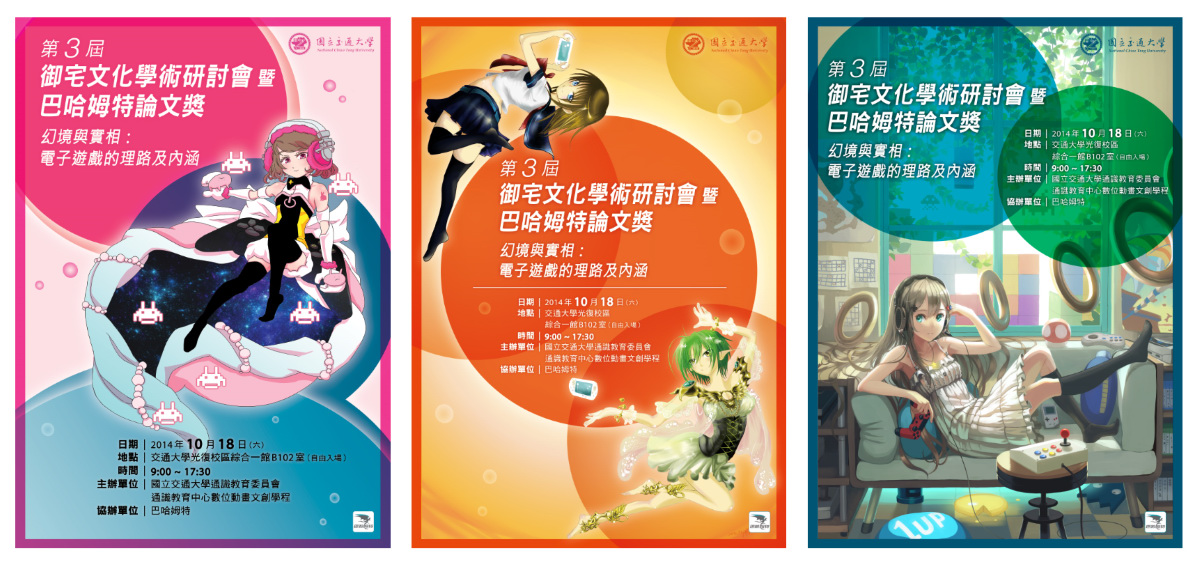 為了營造有別於一般的學術研討會的風格、廣邀 ACG 同好與社會大眾參與,研討會特別設計 3 種視覺海報,分別體現「職業繪師」、「業餘同好」和「在學學生」的作品。「職業繪師」邀請國人知名插畫家 VOFAN 執筆設計,發揮其「光之魔術師」的特色,以窗邊陽光下被電玩周邊包圍的少女為主題。「業餘同好」與「在學學生」的海報也都蘊含著不同的電玩符碼與遊戲元素。