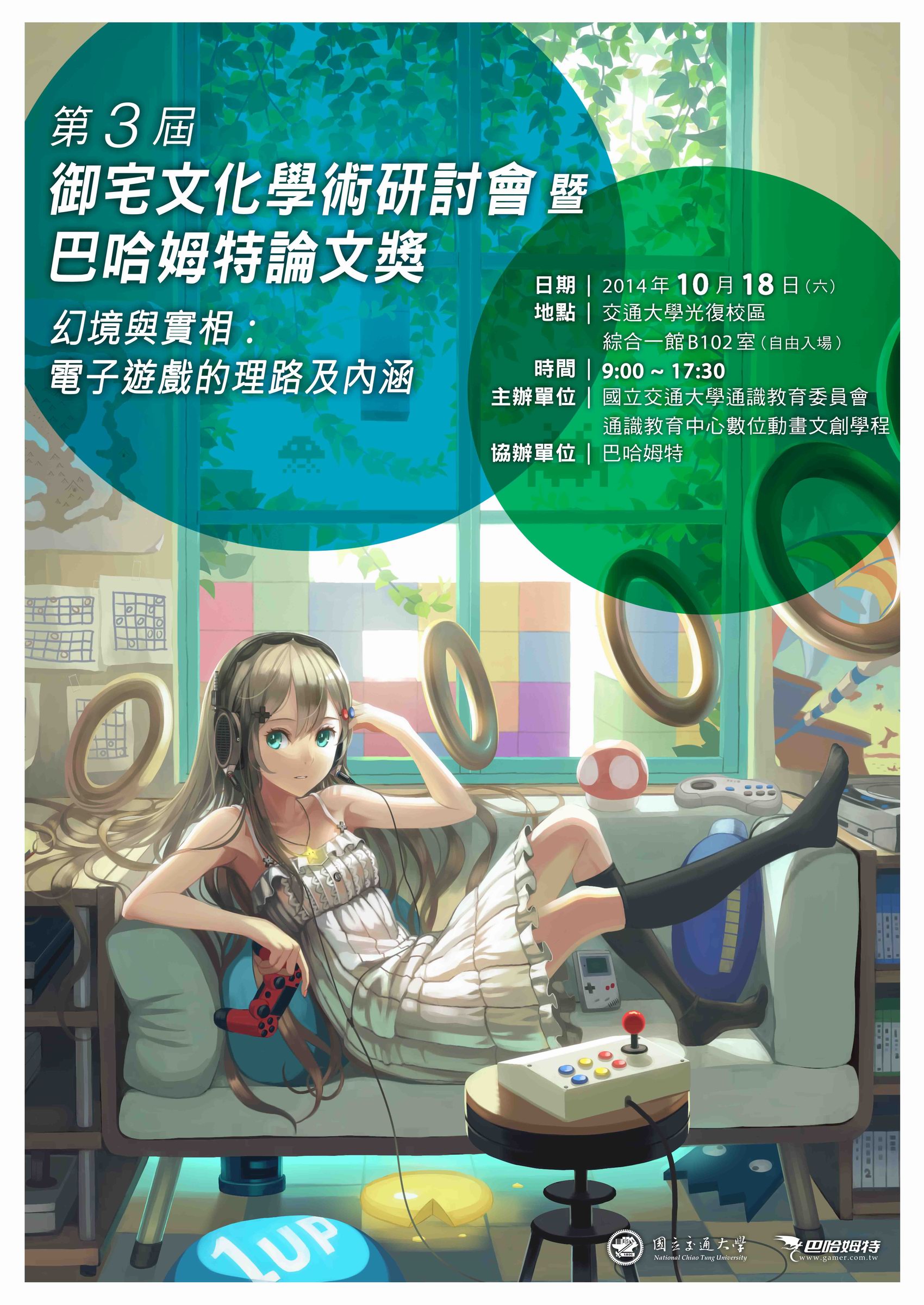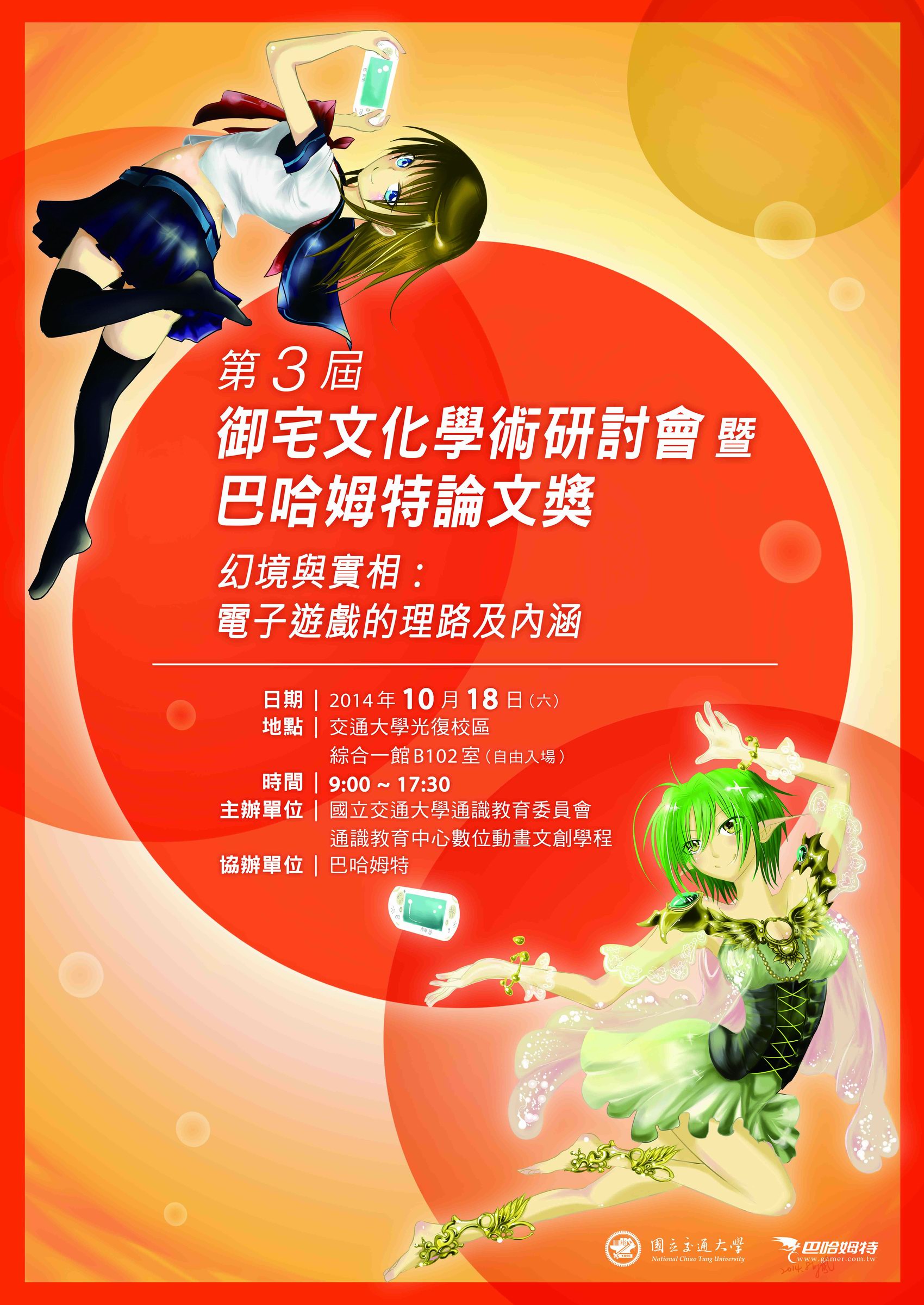 「第 3 屆御宅學術研討會暨巴哈姆特論文獎」預定於 10 月 18 日(六)在國立交通大學綜合一館舉辦,意者可自由參加無需報名,到場參與還有機會可以獲得 VOFAN 親筆簽名的海報與其他精美紀念品,誠摯歡迎對電玩動漫有興趣的同好玩家到場聆聽與參與討論。會議前一週將提供所有參與論文與活動議程詳細資料下載,有興趣的 ACG 同好玩家請鎖定巴哈姆特 GNN 後續報導。