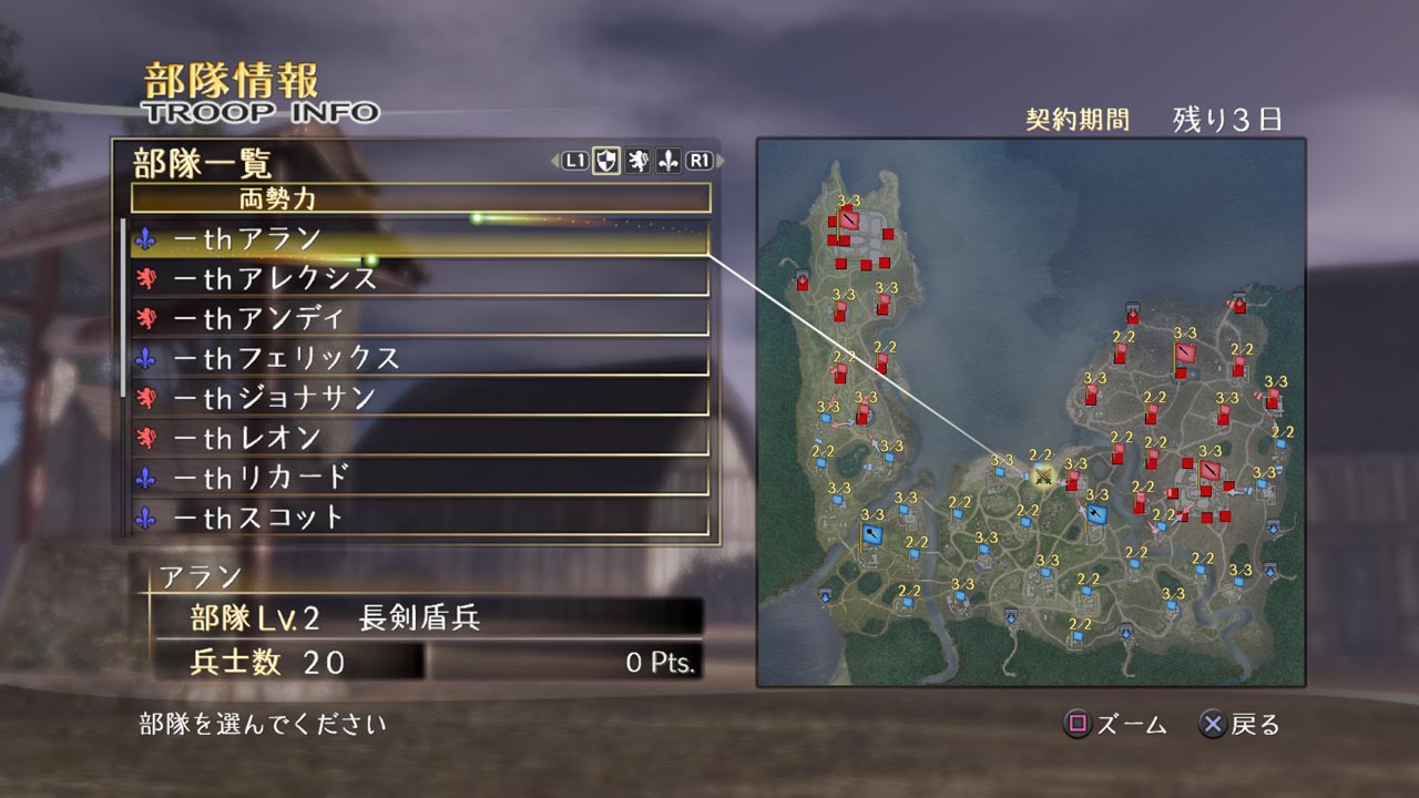 在出擊之前,能夠確認戰況及玩家的能力,並進行武器、防具的裝備。也能確認於戰場內登場的著名隊長(人物)的部隊位置・兵力指數・兵科等情報。