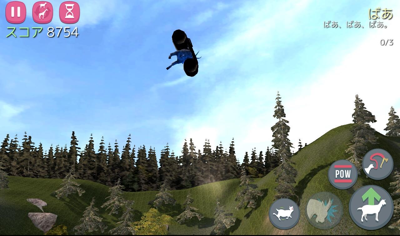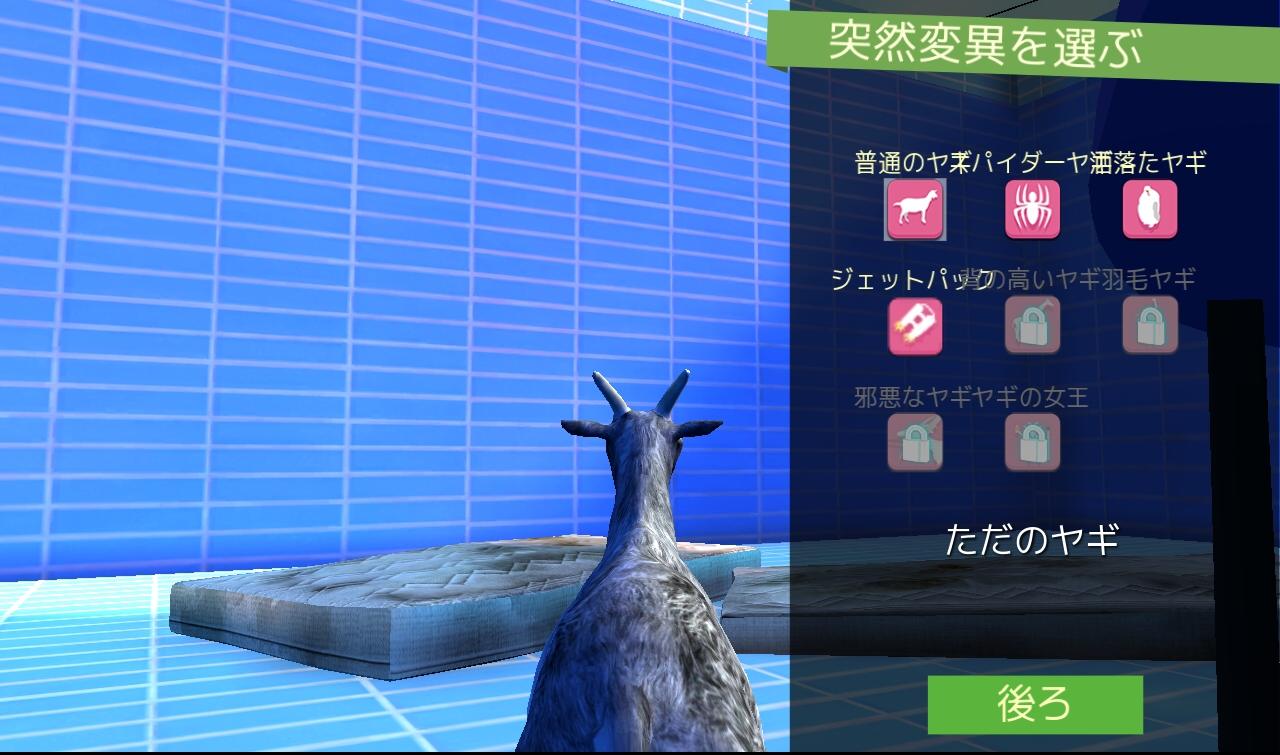 如果感覺有點膩了,那就在按一下畫面左上的按鈕來更換山羊的種類吧!像是用繩子來代替舌頭,就像是蜘 x 人一樣飛翔的山羊,或是看起來簡直就是個企鵝的山羊,還有可以在空中飛舞的火箭山羊等,這些充滿個性的山羊都會根據玩家達成特定條件而增加。