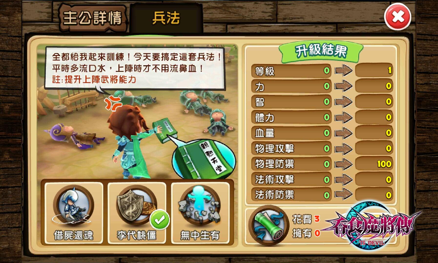 相傳巴豆妖們曾經偷取一批珍貴的兵法藏在巴豆妖秘境,但只要闖過層層關卡獲得兵法,就能夠得到無上的力量!即日起凡是通關第十五大關-「七進七出.趙雲」的玩家,便擁有進入巴豆妖副本的資格,挑戰過關即有機會得到世間至寶「兵法捲軸」,兵法捲軸各有不同的屬性加成,目前已經釋出的兵法為增加血量的「借屍還魂」、增加物理防禦的「李代桃僵」、增加法術防禦的「無中生有」三種,每種需要收集至固定數量才能領悟兵法原理提升武將實力。蒐集兵法捲軸後進入兵法系統,點選想升級的兵法書,上陣武將的屬性將立即獲得強化。