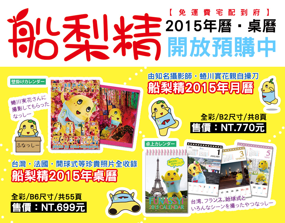 來自日本船橋市的非官方吉祥物「Funassyi 船梨精」,因為爆炸影片中的搞笑模樣吸引了世界各國的粉絲,在台灣也有不少死忠的梨粉。而船梨精也推出了 2015 年掛曆和桌曆,台灣方面由群英社代理接受預購。