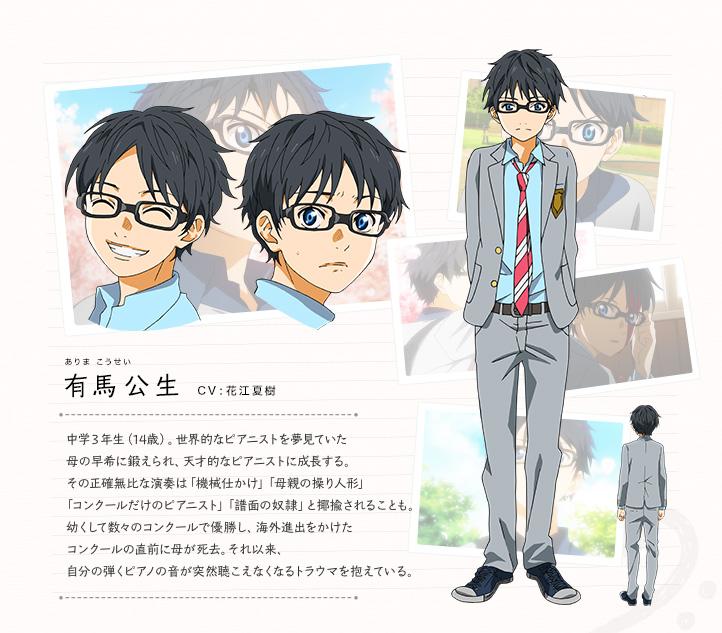 從公生當初華麗但眼神卻不帶一絲感情的鋼琴演出,到小樁豪氣大棒一揮然後校舍玻璃應聲碎裂,短短幾幕大致上就很快的把公生晦暗的回憶造就的靜態性格,以及小樁大咧咧的個性作了明確的定性,還有光著腳丫在公園和孩子們一起演奏而展現不拘小節個性的薰,以及語氣較為輕挑的亮太,完整的表現 角色的特徵。