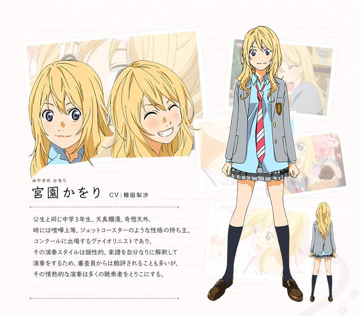 直到了國中三年級,在鄰居澤部椿(CV:佐倉綾音)的引見下,公生遇到了那不拘章法自由演奏小提琴的少女宮園薰(CV:種田梨沙),單一灰色的世界開始慢慢有了一丁點的變化......