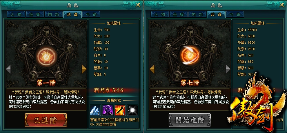 除此之外,在「武魂系統」裡,每當武魂到達 1、3、5、7 階,便能透過特定秘笈的學習,就能擁有武魂的專屬技能,這些專屬技能能給予對手致命傷害,讓玩家在戰鬥中更顯的如虎添翼!