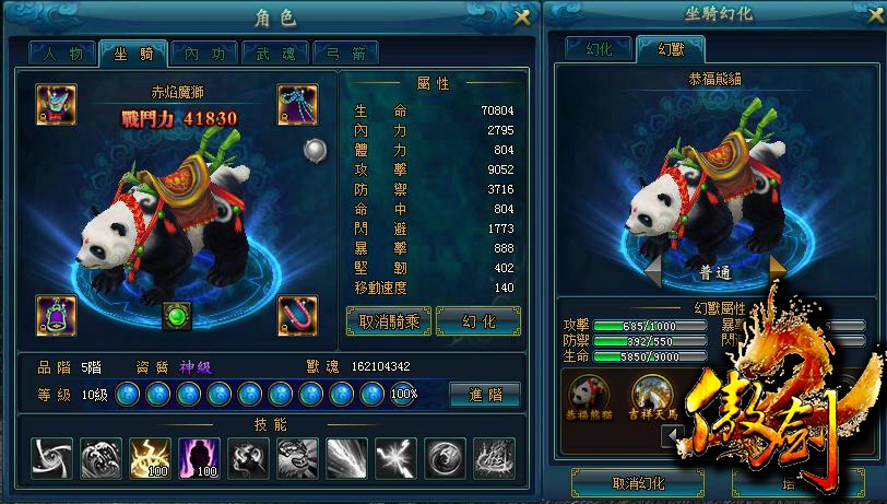 本次改版中,系統特別為「恭福熊貓」加開「幻獸培養」功能,只有熊貓 可使用「幻獸培養」增加座騎戰力,在培養的同時需要大量的獸魂,就和一般座騎一樣,可由「普通 」升級到「 神級」。