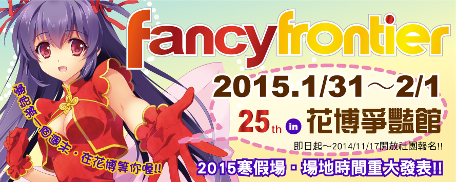 每年寒暑假在台北舉辦的大型同人展售會「開拓動漫祭(Fancy Frontier)」,正式宣布了明(2015)年的第一場活動開拓動漫祭 Fancy Frontier 25 將於 1 月 31 日、2 月 1 日登場,並將從大家熟悉的台大體育館搬至花博爭艷館舉辦的消息,目前並已開放了社團報名。以下為官方所公開之相關公告資訊。
