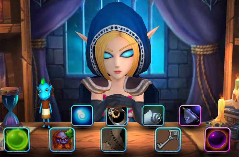在主城的正中間有個精靈酒館,和漂亮的血精靈老板娘搭訕,花費一定費用就可以招募英雄、裝備或碎片道具。酒館開放等級為 5 級。