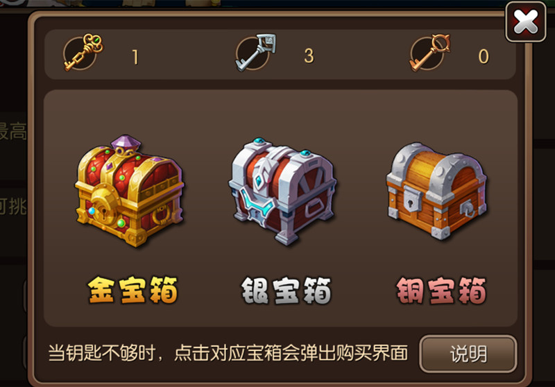 在主界面點擊“寶物”的按鈕可以進行挖寶活動,副本界面戰鬥過程中獲得的寶箱鑰匙可以在寶箱界面中打開寶箱,獲得各種獎勵。