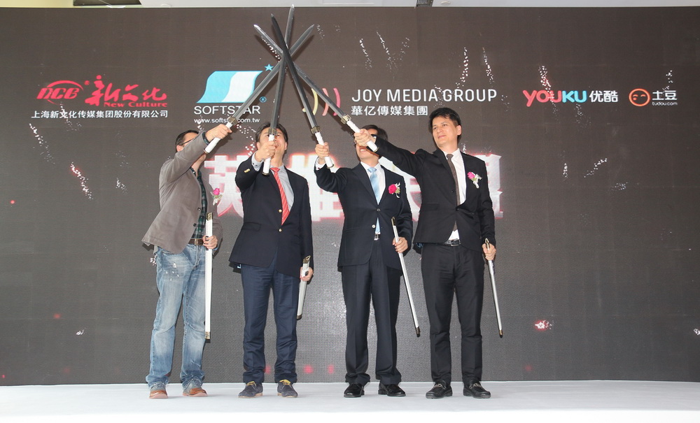 左起優酷土豆副總裁朱向陽、上海新文化總裁楊震華、大宇資訊董事長凃俊光、華億董事長蘇聰儒共同啟動合作儀式