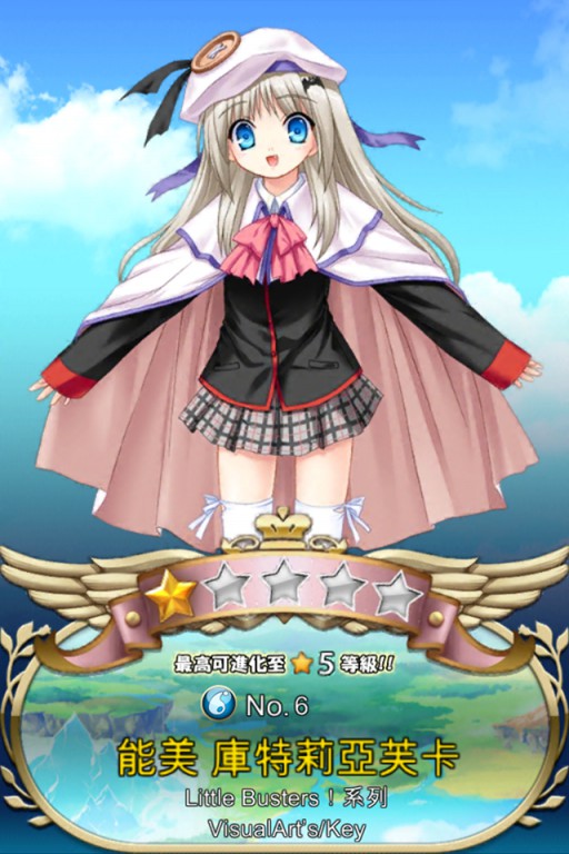 Little Busters!》不論台日都很受歡迎,其中蘿莉形象的「能美 庫特莉亞芙卡」以其可愛討喜模樣脫穎而出成為本作的看板娘,除了做為遊戲 icon 的圖像代表外,新手勇者來到女神城時,由女神所贈予的少女們當中,也有可能出現「能美 庫特莉亞芙卡」。