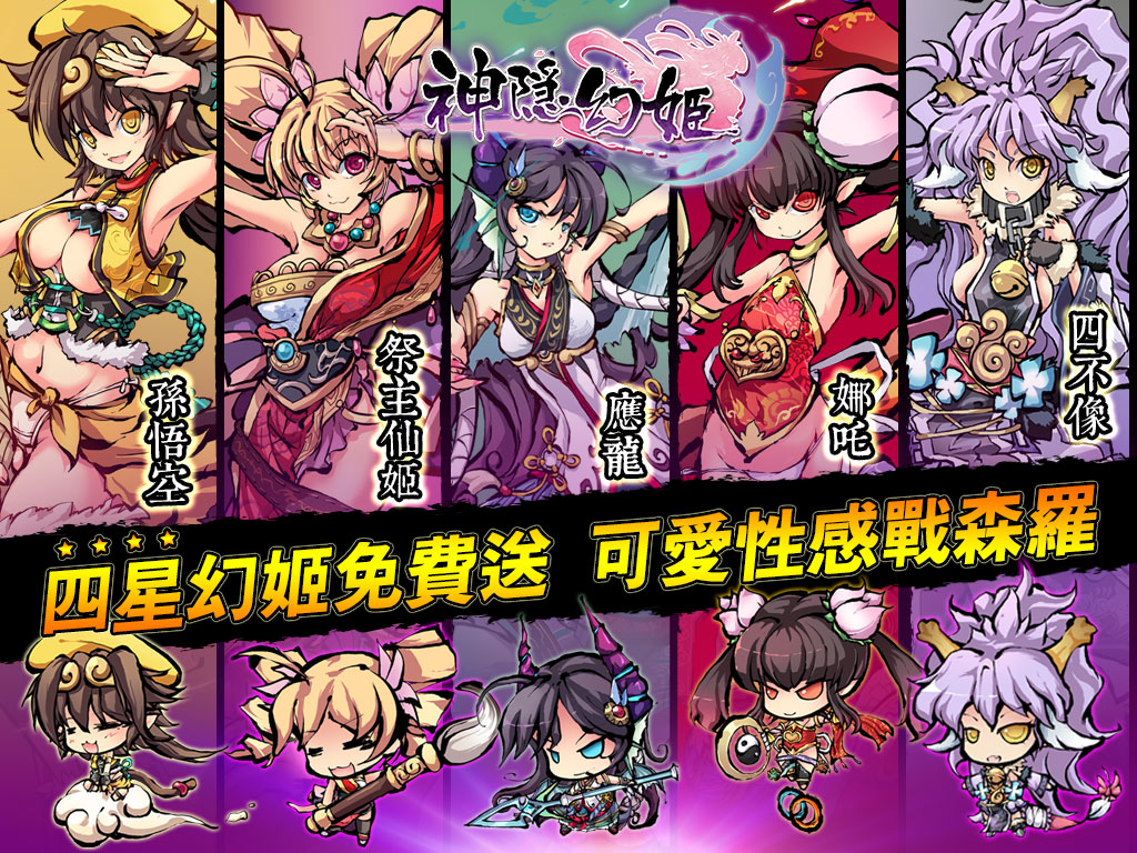 神隱幻姬》讓新手玩家在進行新手任務時就能夠免費在判幣召喚祭壇中召喚到等級』』相階』』(四星) 以上的幻姬角色,裡面包含了限定的『孫悟空』、『祭主仙姬』、『應龍』、『娜吒』及『四不像』... 等絕美幻姬,讓玩家感受戰谷營運團隊滿滿的誠意。