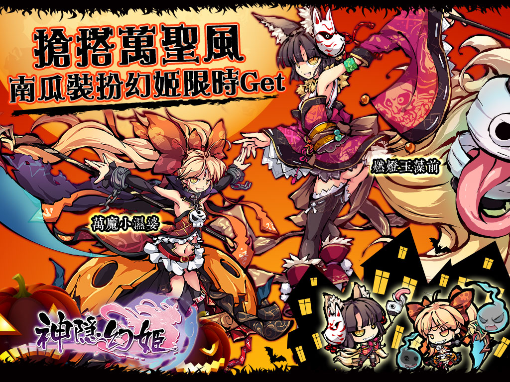 神隱幻姬》為了讓玩家能在遊戲中有過節的氣氛,特別推出萬聖節限定活動,玩家可以透過購買商店中的福袋,就有機會獲得身穿南瓜裝的『萬魔小濕婆』及手持日本鬼燈籠的『燃燈玉藻前』兩位幻姬,遊戲中還特別加開萬聖節活動副本,玩家也可以在萬聖節的活動關卡里,有機會獲得『萬魔小濕婆仙晶』,湊齊 4 個萬魔小濕婆仙晶,便可召喚獲得『萬魔小濕婆』,除此之外活動副本中還有機會獲得限定的升階道具,讓玩家度過與眾不同的萬聖節。