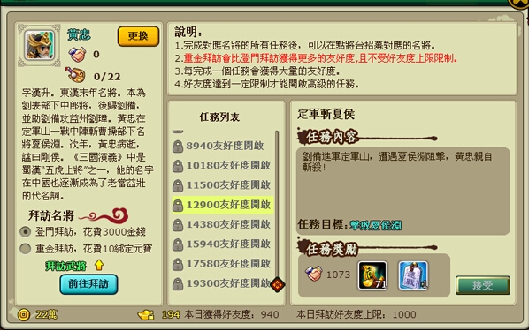 看看蜀國五虎上將之一的黃忠,想要獲得他的效忠,需要花費的精力可不少,一共需要 19300 的友好度,且需要完成 22 個任務。不過爲了這位名將,一些都是值得的。