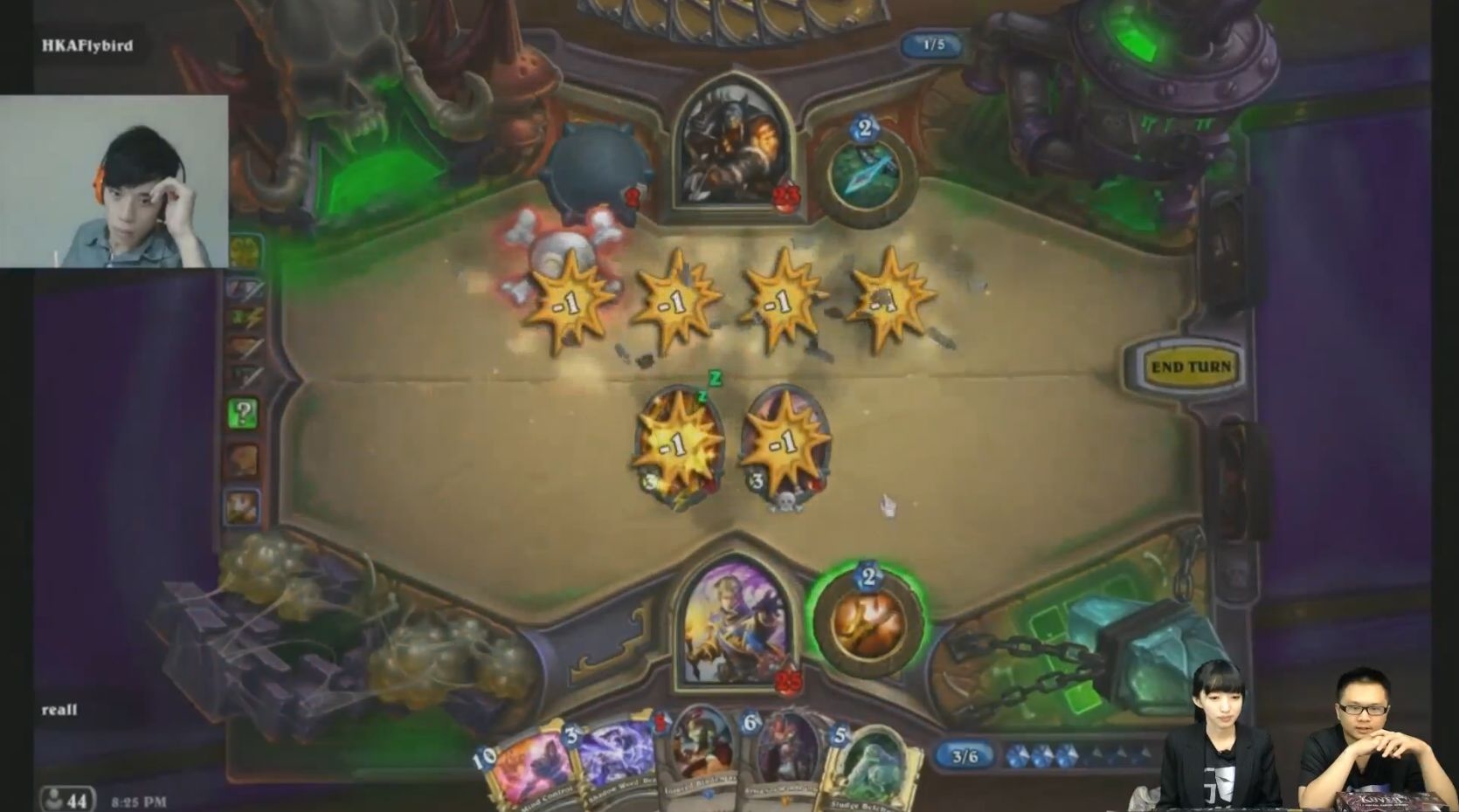 reall 出戰同為台韓菁英群選手 HKA.Flybird(原 ID:飛鳥戰神),reall 首戰以獵人對抗 HKA.Flybird 的戰士,reall 殯葬管理員、痲瘋地精、飛刀手的強勢起手讓 HKA.Flybird 戰士血量至遊戲中期已有不少壓力,即便 HKA.Flybird 使用森金禦盾大師稍稍拖延攻勢也無法抵抗,reall 順利取得首勝。 HKA.Flybird 以盜賊反擊成功打掉 reall 獵人與德魯伊,紹安退無可退拿出最後的牌組牧師反收奇效,靠北郡教士與狂野火占師的發揮讓 reall 連續擊殺 HKA.Flybird 盜賊與獵人,進而取得最終勝利。