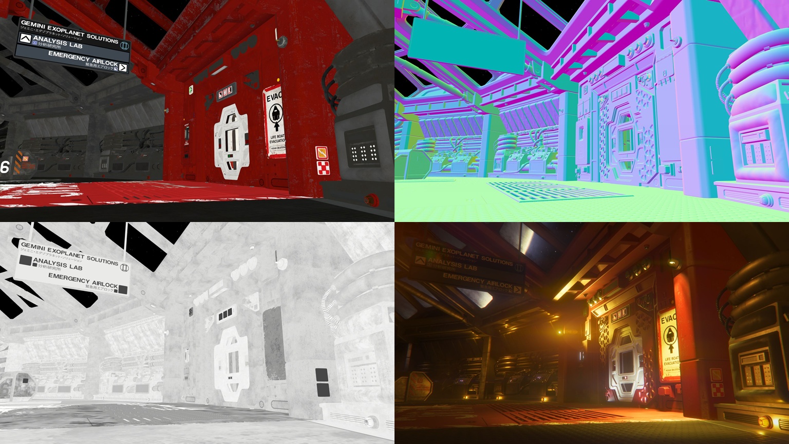 左上:Albedo,右上:法線貼圖(Normal mapping),左下:光澤反光(Shininess),右下:完全照明的場景(Fully-lit)