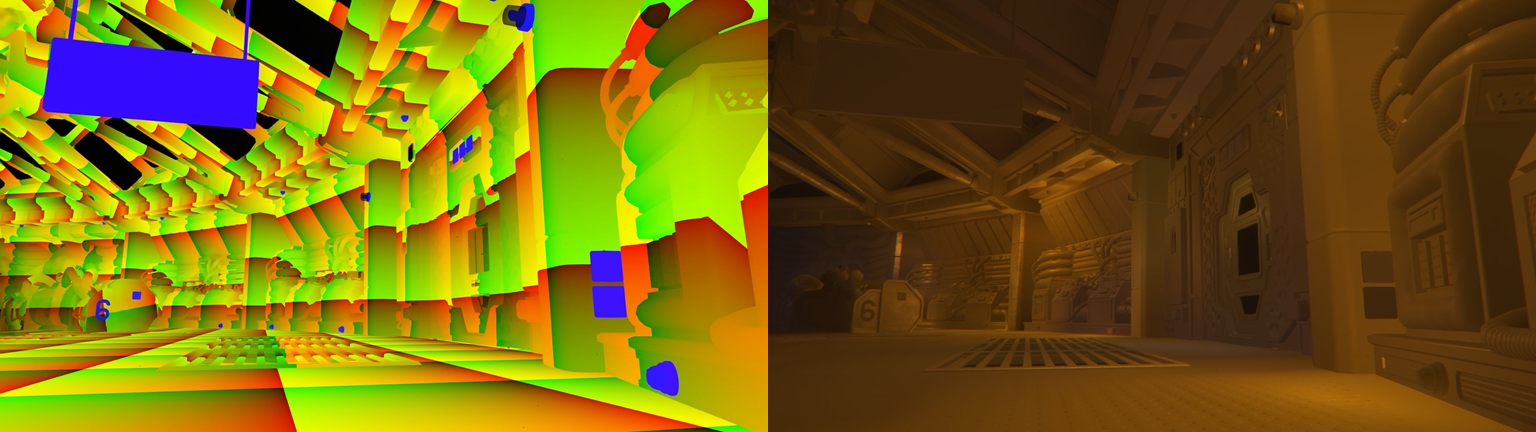 左:光跡追蹤光源圖,右:只用光源圖資料照射的環境。請注意看即時光照的精準擬真效果。
