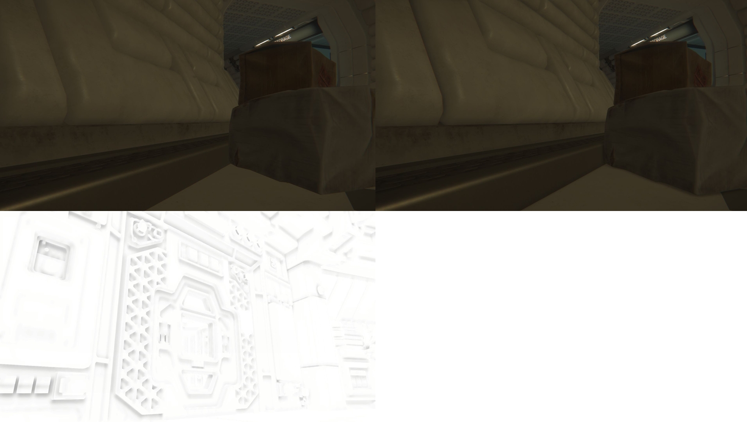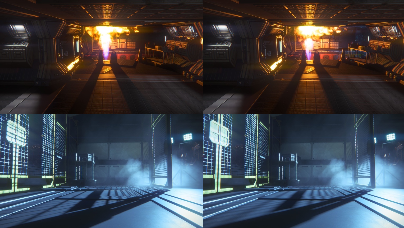 異形:孤立》的動態光照與即時光跡追蹤,著色器另外還採用 HDAO+(AMD 所開發的計算環境光遮蔽技術),當光線照到場景中的裂口與縫隙時,就會運用此技巧來計算物件產生的陰影。HDAO+ 採用適合支援 AMD Radeon™顯示卡的 DirectCompute 來計算這些陰影的大小與強度。HDAO+ 運用 G-buffer 的資訊並以多種解析度算圖,協助在品質與效能之間取得最佳的平衡點。