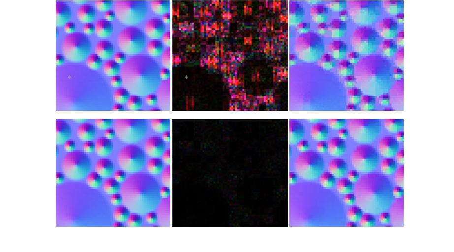 壓縮材質的問題在於壓縮法會衍生各種圖像瑕疵。大家都看過 JPEG 格式圖檔像素顆粒粗糙的狀況,DXT 的瑕疵就很像這種缺陷。下圖隔離出這些瑕疵,越多顏色代表更高的瑕疵數量。