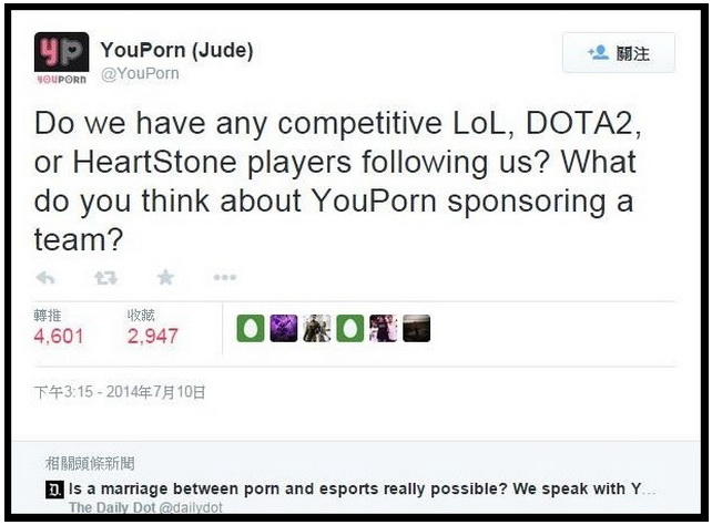 今年 7 月,知名成人網站「YouPorn」於推特發布一則訊息,內容表示有興趣贊助《Dota2》、《