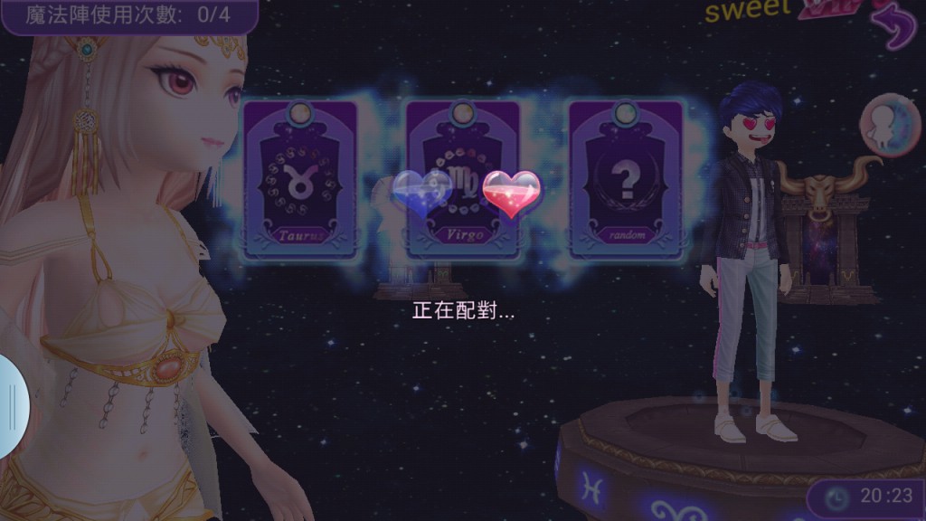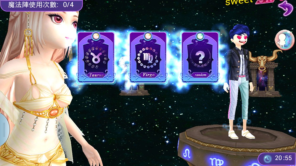 戀舞廣場左側的星戀魔法陣就會發出魔法光芒,奇幻的力量就會帶玩家進入神秘絢麗的魔法世界,命運女神就會給您三張星座牌,玩家隨著心意隨選一張,系統就會在所有玩家中選擇和您最速配的另一半唷!如果星座匹配成功後,就會將兩人送入專屬的 3D 場景,讓牽起紅線的戀人展開浪漫的邂逅。