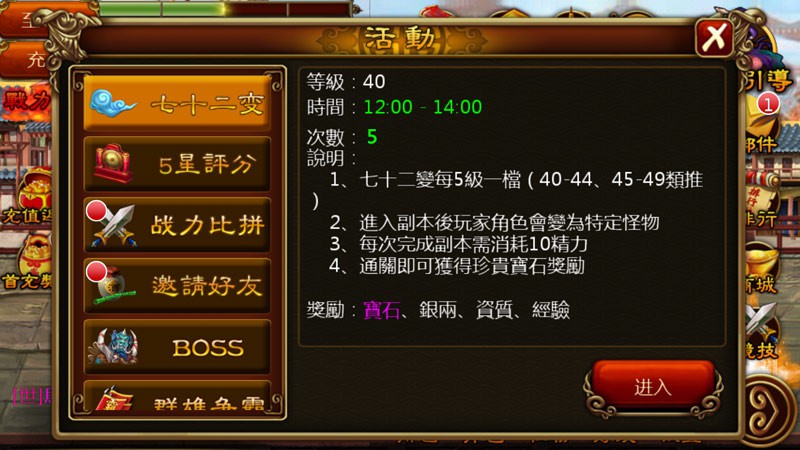 萬聖節期間開放「七十二變」活動關卡,玩家可變身遊戲內怪物,體驗平常讓人蛋疼的超強破壞威力,享受以一打十的破壞快感!每場戰鬥結束後還可拿到 3~8 級的各式寶石,讓玩家有吃又有拿!