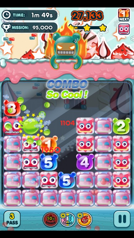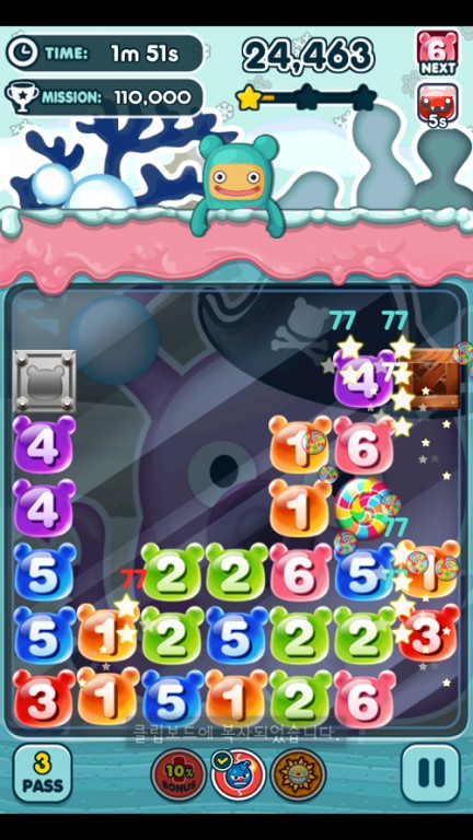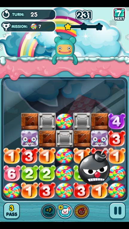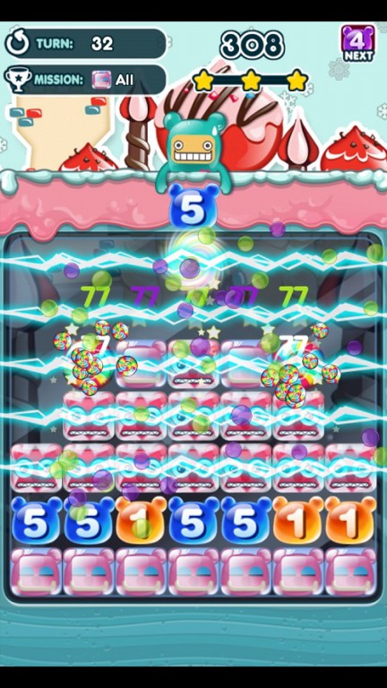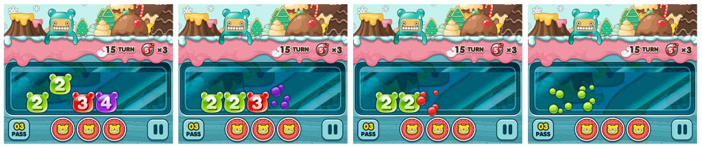 舉例來說,若是將數字軟糖「4」放在並排著 3 個軟糖的地方的話,連接起來的軟糖變成「4」個,那麼「4」這個軟糖就會爆炸,不管是直向或是橫向皆會列入計算。關於剩下的數字軟糖,若是數字軟糖的數量和數字軟糖上的數字一致的話,也可以繼續爆破形成 Combo。