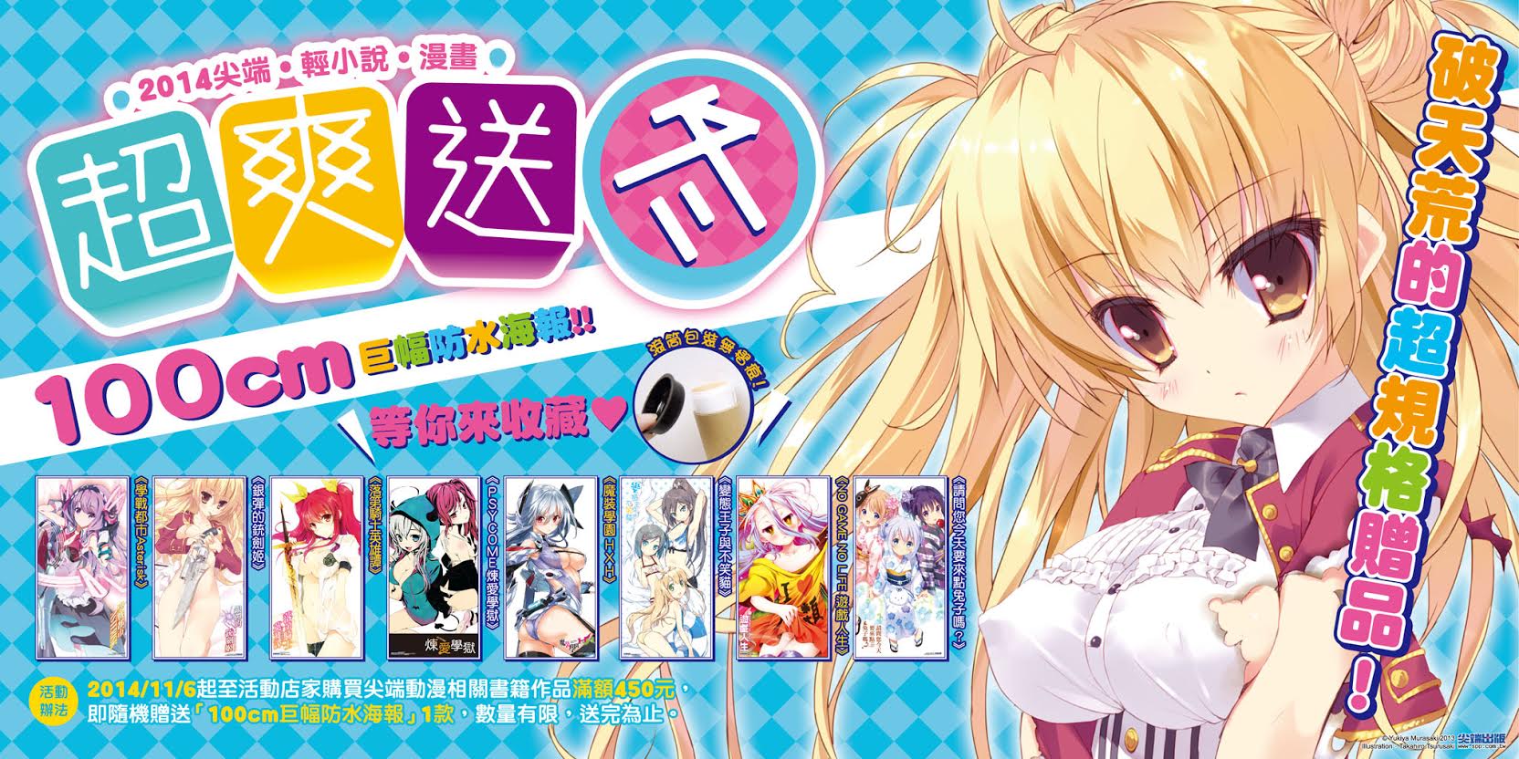 尖端出版於2014年11月起,將舉行年度最強促販活動──尖端「冬季超爽送」! 2014年11月6日起至活動店家購買尖端動漫相關書籍作品滿額450元,即可隨機獲得「100cm巨幅防水海報」1款(硬質滾筒包裝無折痕)!(可累積贈送!)共有8款隨機贈送一款!贈品數量超級有限,送完為止。
