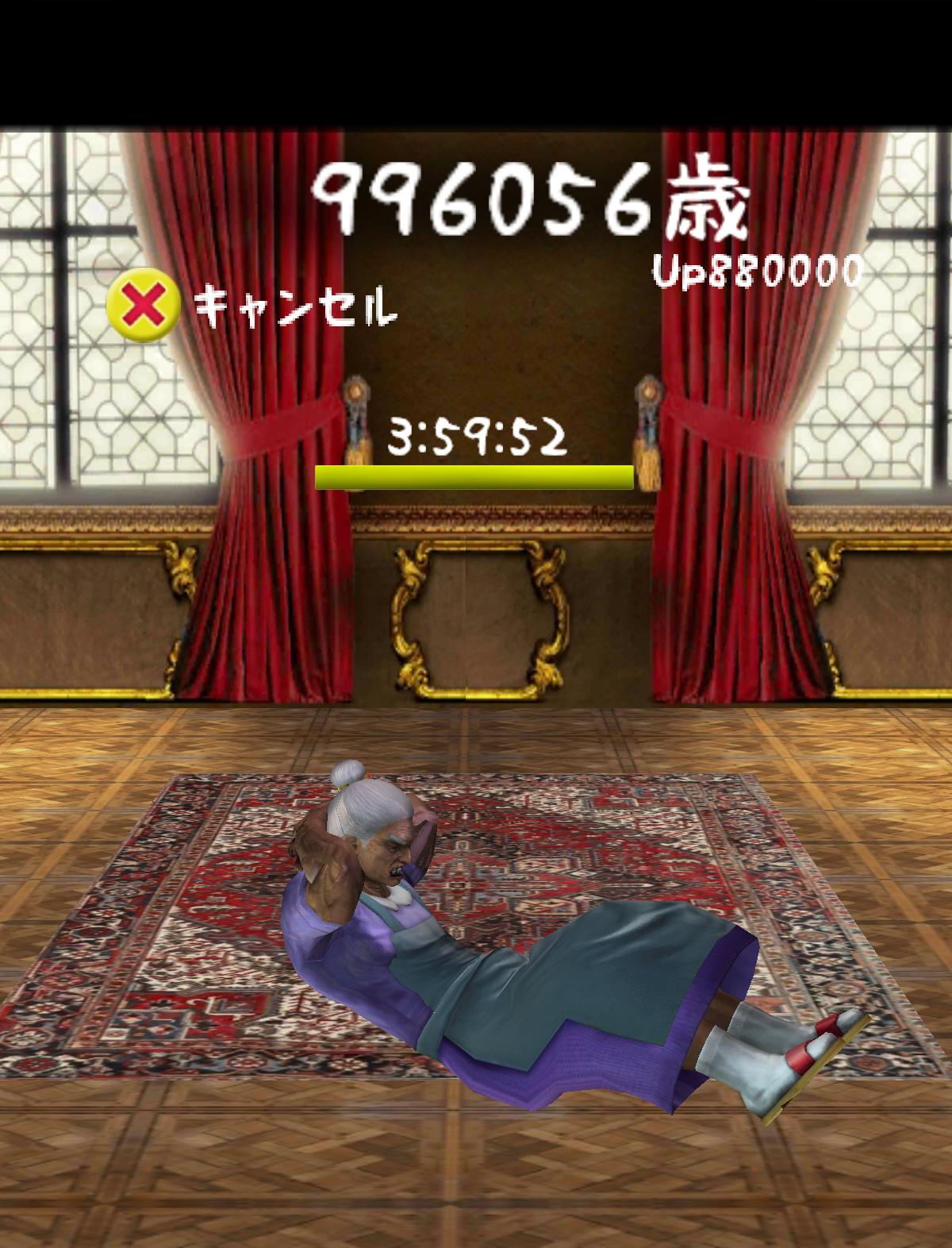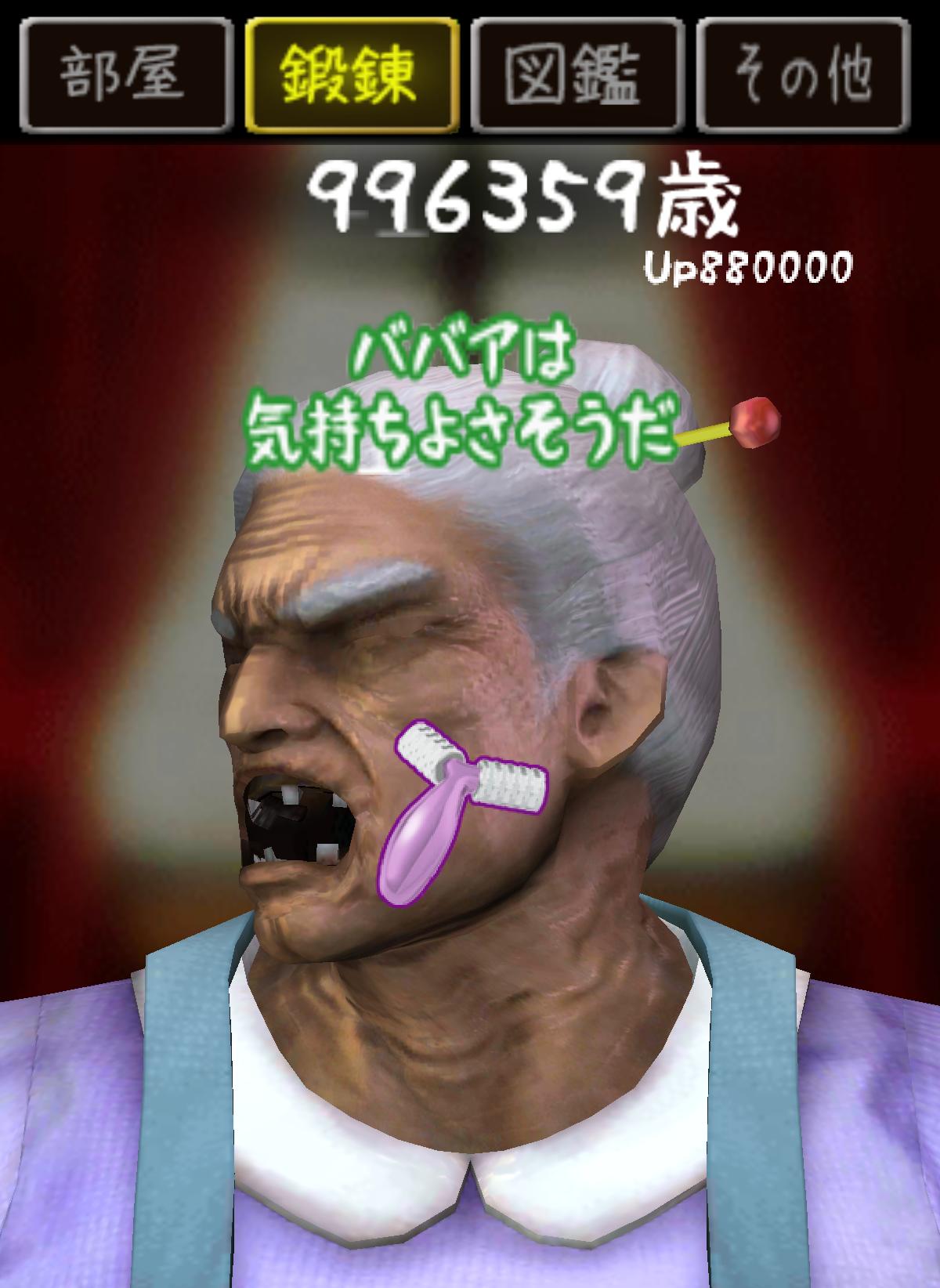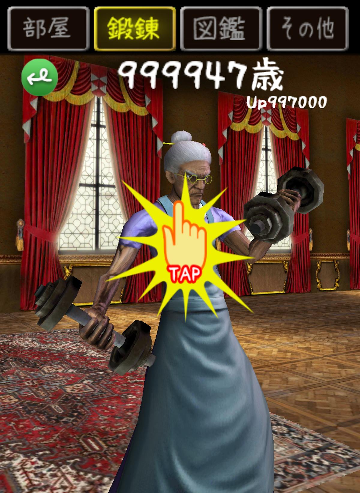 一進遊戲,就可以看到 100 萬歲的歐巴桑盯著玩家看…玩家如果有興趣的話當然也可以觸碰她…或者在畫面隨便撥動都可讓她進行運動,這些動作都可以讓歐巴桑減少一些年齡。想要快一點減少年齡的話就必須靠著紮實的鍛鍊了。特別的是,當年齡減少到一定程度時歐巴桑的外觀就會產生改變喔!