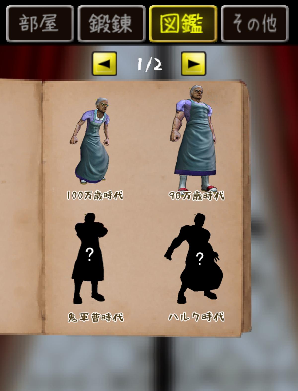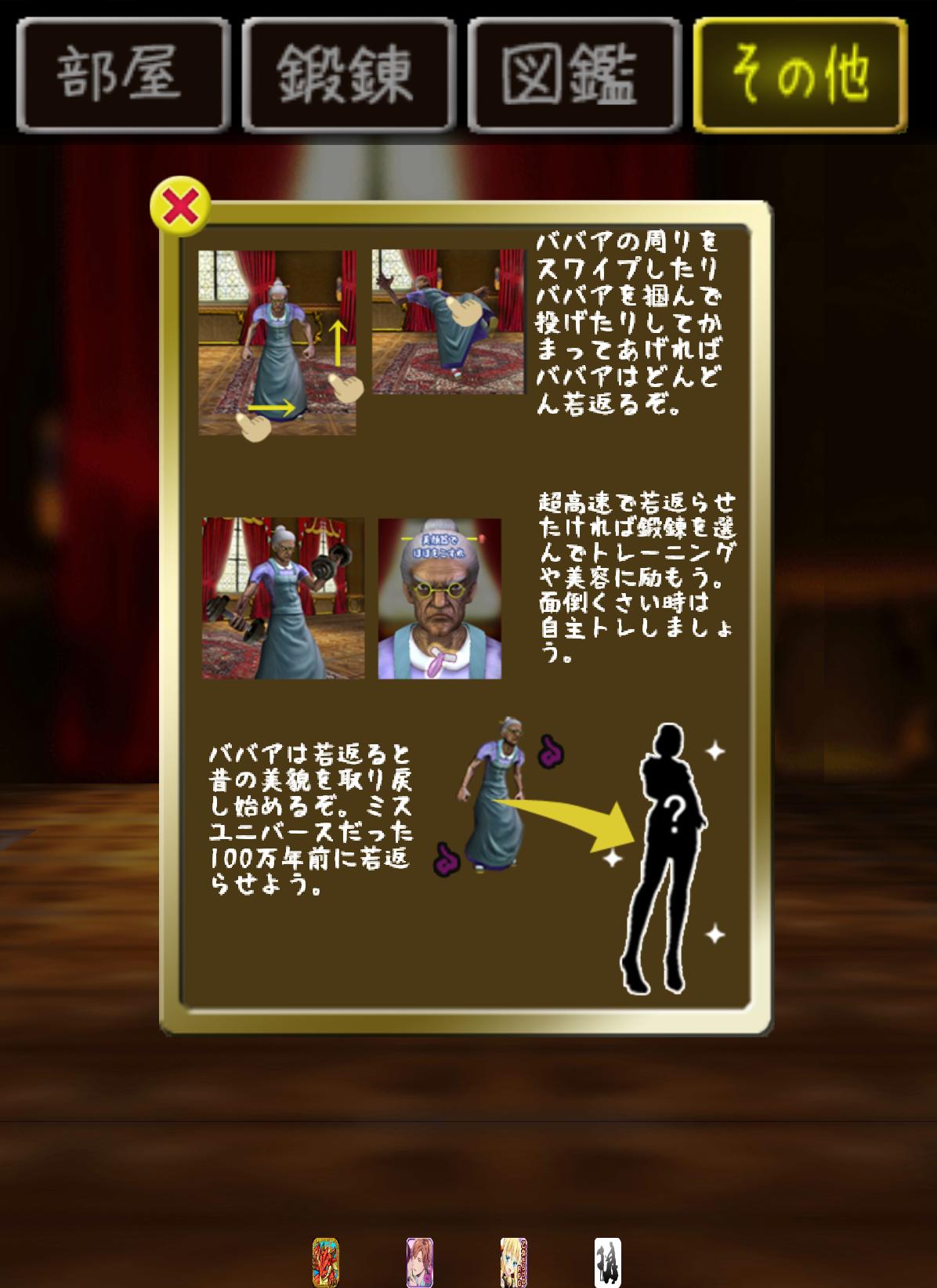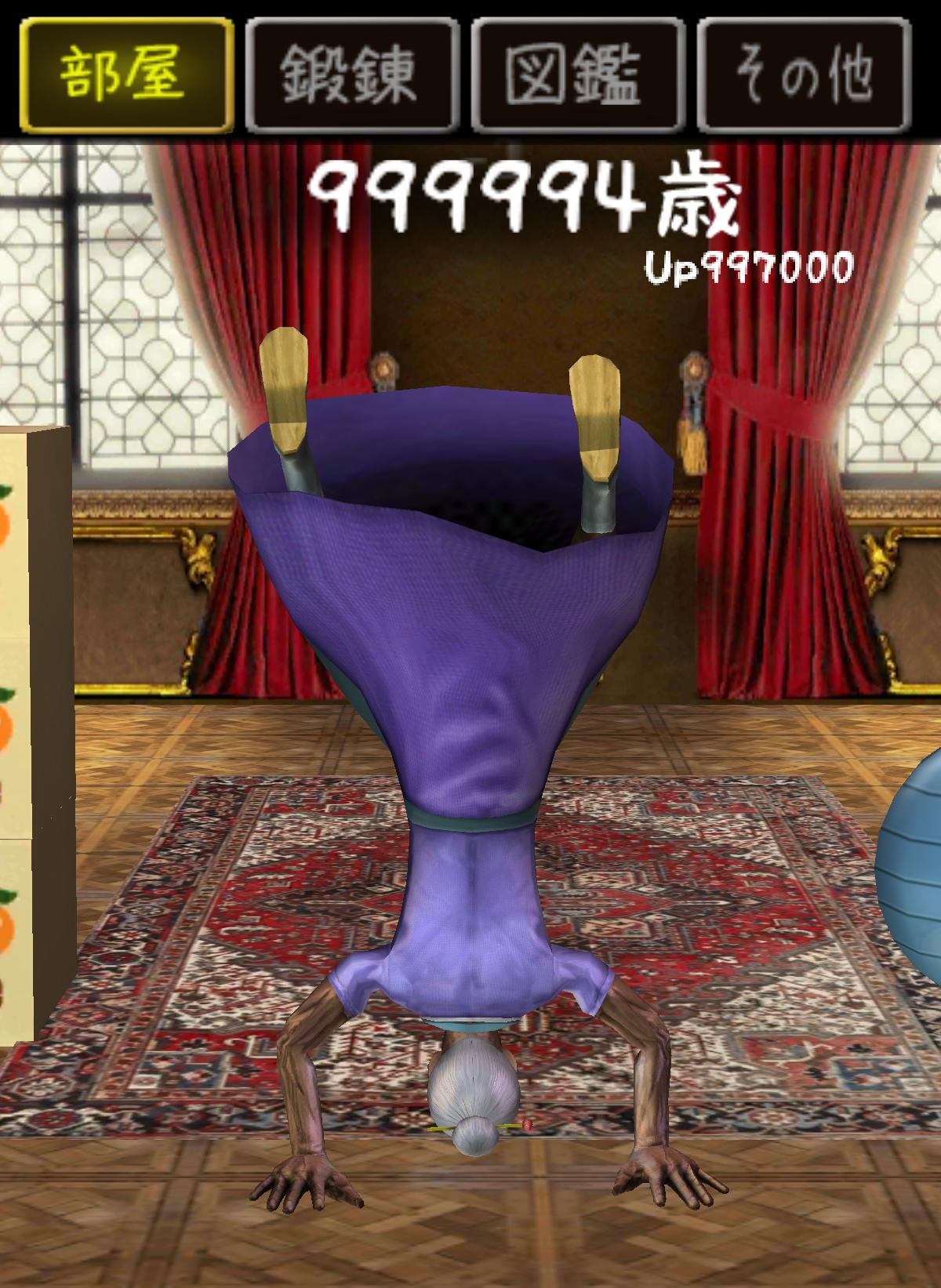 一進遊戲,就可以看到 100 萬歲的歐巴桑盯著玩家看…玩家如果有興趣的話當然也可以觸碰她…或者在畫面隨便撥動都可讓她進行運動,這些動作都可以讓歐巴桑減少一些年齡。想要快一點減少年齡的話就必須靠著紮實的鍛鍊了。特別的是,當年齡減少到一定程度時歐巴桑的外觀就會產生改變喔!