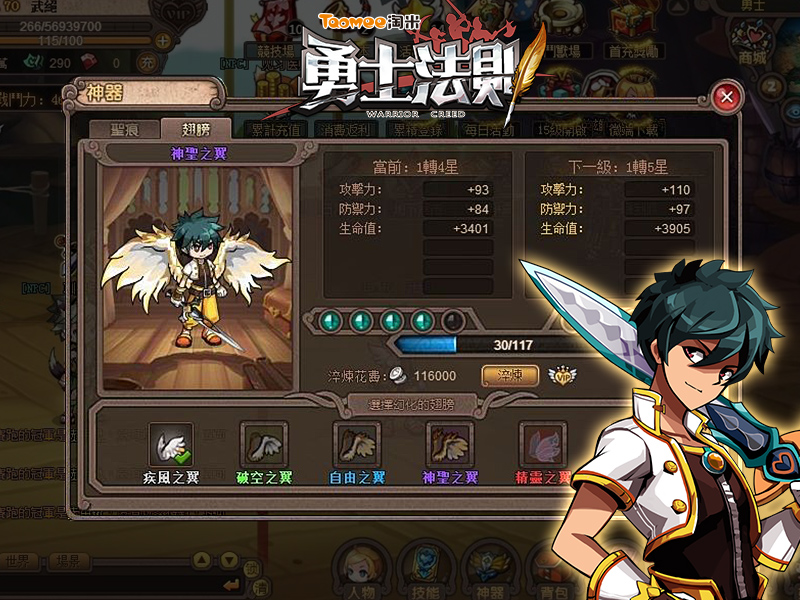 當角色等級達到 30 級後,下方功能列「神器」系統中會開放「翅膀」系統。翅膀的品質有橙、紅、紫、藍、綠、白六種(品質排序由高到低),前四種 (白、綠、藍、紫) 都可以消耗一定的銀幣進行淬煉升級,而想要更高品質的紅色和橙色翅膀就要花費一定的鑽石才能進行淬煉升級。