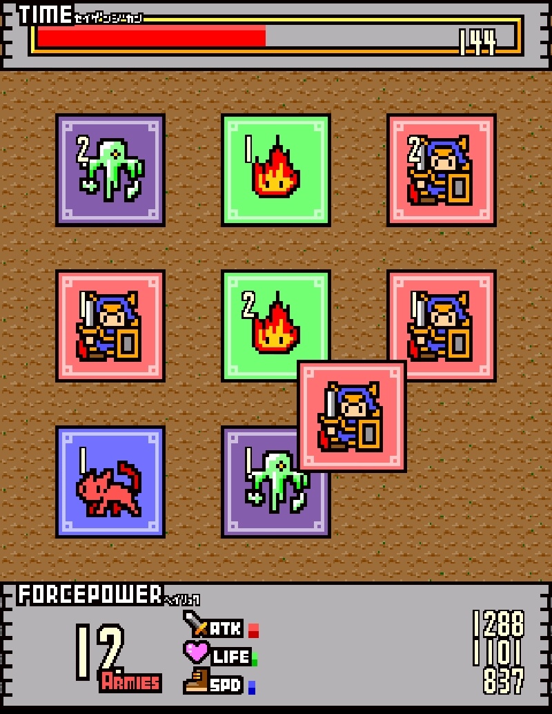 如果不小心疊到不同顏色的卡片時,就會將之前強化的進度全部取消,這點要特別注意戰鬥正式開始時,敵我雙方的角色都會以決定行動順序的「SPD」來輪流行動,這時會以代表攻擊力基準的「ATK」來打掉 9 人合計的「體力(LIFE)」。