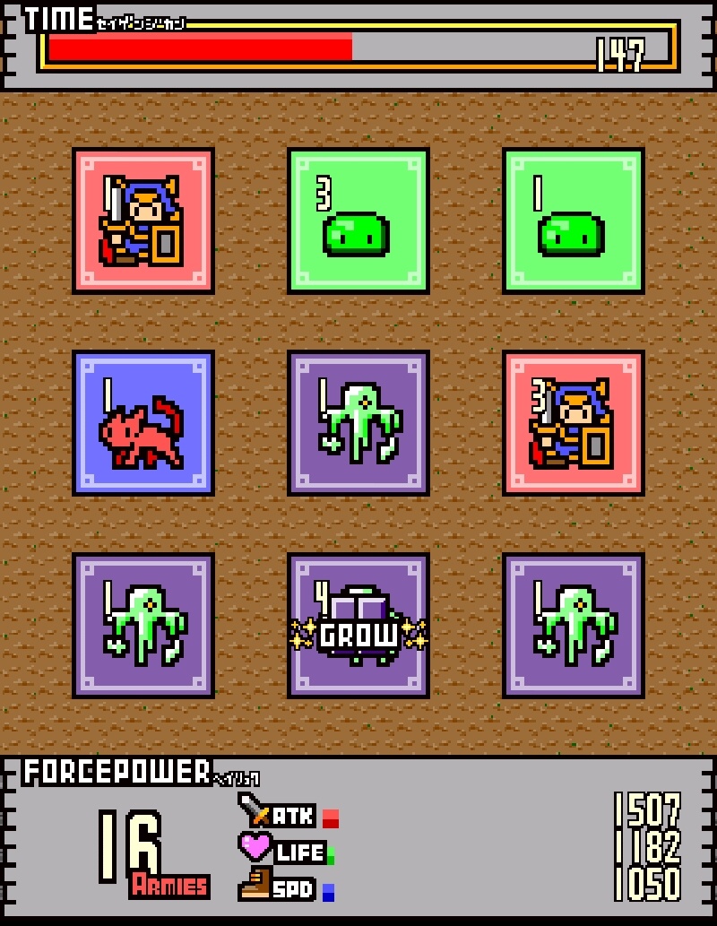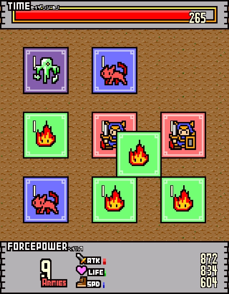 戰鬥是在 3X3 的 9 格陣地上進行,敵我雙方 9 名角色的軍團部隊要在此激烈的對戰。玩家要在小隊編成畫面中針對紅、藍、綠、紫 4 種顏色的卡片來各自配置角色。接著在戰鬥中首先會有強化時間,畫面中會有 4 種卡片隨機配置在 9 個格子上。玩家必須在一定時間內將各卡片拖曳到別的格子,只要讓相同顏色的卡片疊在一起就可以強化角色了。