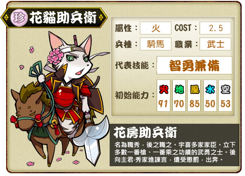 火屬性貓武將「花貓助兵衛」本名職秀,後改名為職之,為宇喜多家臣,曾多次立下傲人功績,十分驍勇善戰。其代表技能「智勇兼備」可使攻擊力和策略自動提升。