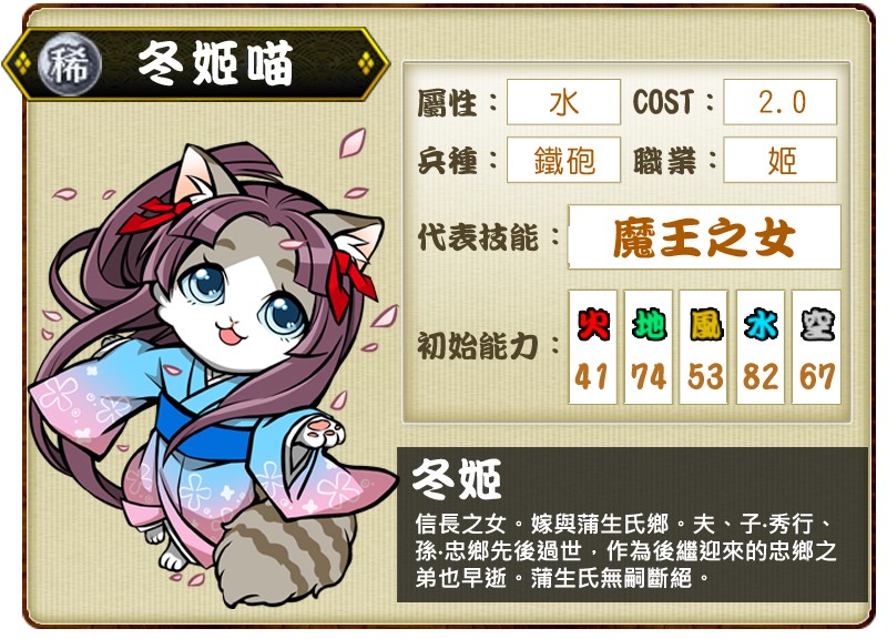 台灣先行貓武將稀卡「冬姬喵」為織田信長之女、蒲生氏鄉的妻子,由於蒲生一家先後早逝,以致蒲生氏無嗣斷絕。水屬性的「冬姬喵」代表技能為「魔王之女」,當我方隊伍組合為全鐵砲隊時,將可使我方全體兵力恢復。