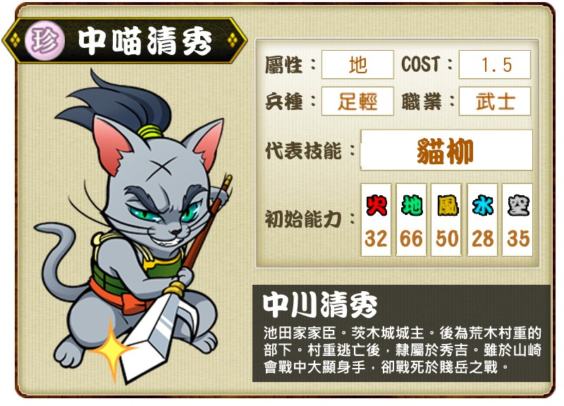 地屬性貓武將「中喵清秀」為池田家家臣、茨木城城主,後效力於荒木村重協助攻打織田信長,後降兵於信長、反攻荒木村重。其代表技能「貓柳」可於一定時間內吸引複數敵人的注意。