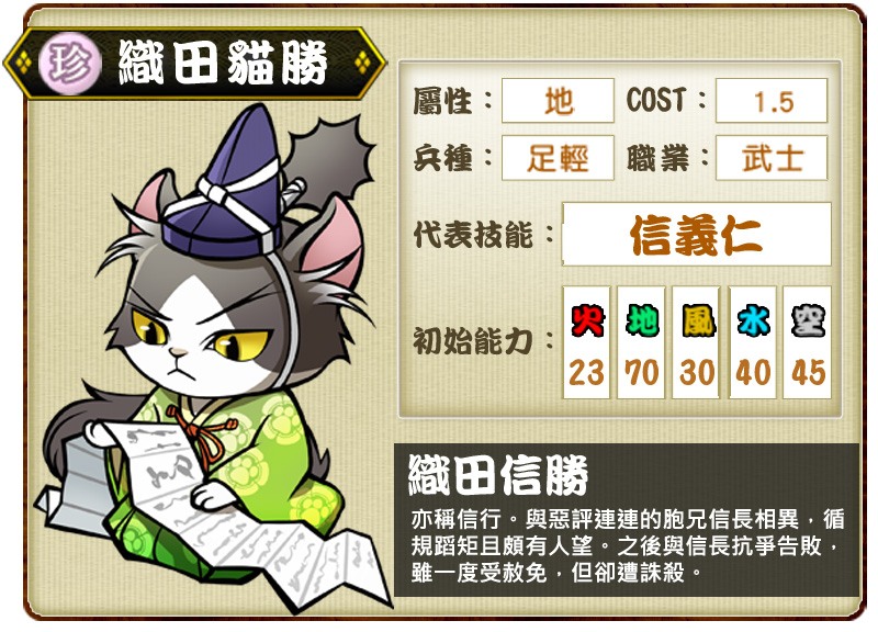 地屬性貓武將「織田貓勝」是織田信長的弟弟,與惡名昭彰的哥哥性格相去甚遠,做事循規蹈矩且頗得人心。其代表技能「信義仁」可在我方隊友被攻擊時,幫忙阻擋傷害,同時提升本身防禦力。