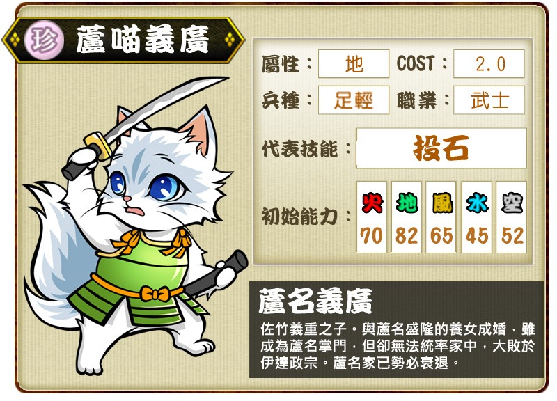 地屬性貓武將「蘆喵義廣」為佐竹義重之子,與蘆名盛隆的養女成婚,雖繼承蘆名家第二十代家督,卻未因此受到蘆名家家臣信賴,隨後更在與伊達政宗進行摺上原之戰時大敗,使蘆名家宣告滅亡。其代表技能「投石」可對敵貓一隻進行遠距離攻擊,被擊中者將會有一定機率陷入混亂狀態。