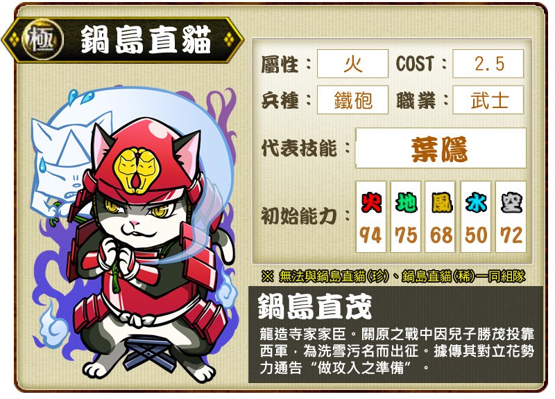 改版推出的唯一極卡「鍋島直貓」為龍造寺家家臣,幼名彥法師,別名鍋島信生。關原之戰時,雖直茂之子勝茂參與西軍,但是直茂已預測到東軍將會獲勝,在西軍失敗後讓勝茂快速離開戰場,轉投東軍獲得最終勝利。火屬性的「鍋島直貓」其遊戲中代表技能「葉隱」,在身為總大將時可攻擊複數敵貓,並解除被攻擊對象之風屬性強化。