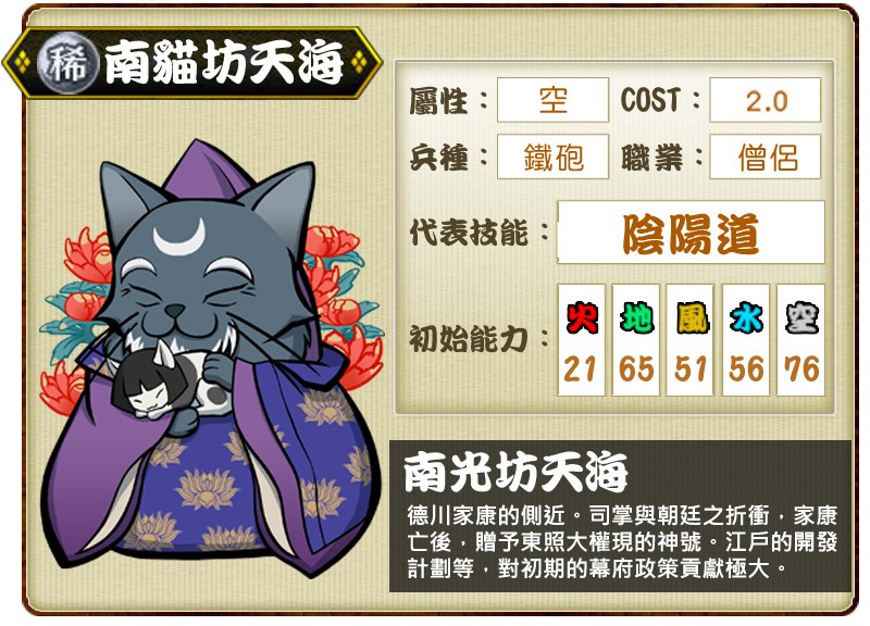 稀卡「南貓坊天海」為德川家康的心腹,手中握有朝廷大權,甚至在家康死後受贈「東照大權現」之稱號。空屬性的「南貓坊天海」代表技能「陰陽道」,可使術攻擊的對象集中到一隻身上,並使傷害效果上升。
